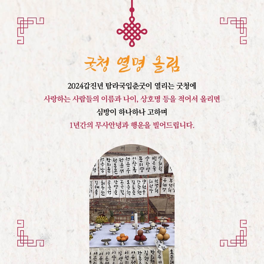 2024갑진년 탐라국입춘굿이 열리는 굿청에 사랑하는 사람들의 이름과 나이, 상호명 등을 적어서 올리면 심방이 하나하나 고하며 1년간의 무사안녕과 행운을 빌어드립니다.