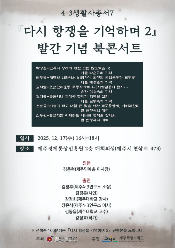 <제주4·3연구소 생활사 발간 기념 북콘서트 개최 안내>“다시 항쟁을 기억하며 2” 제주4·3연구소 생활사 발간 기념 북콘서트 개최 안내>“다시 항쟁을 기억하며 2” ○ 일시: 2025.12.17(수) 16:00~18:00○ 장소: 제주경제통상진흥원 2층 대회의실(제주시 연삼로 473)○ 참가접수 : https://forms.gle/4iifW1n6CKhRqgg19○ 문의: 제주4·3연구소 064-756-4325 ※ 선착순 100분께는 『다시 항쟁을 기억하며 2』 단행본을 드립니다. 많은 관심과 참여 부탁드립니다. 카테고리 없음 2025.12.09
