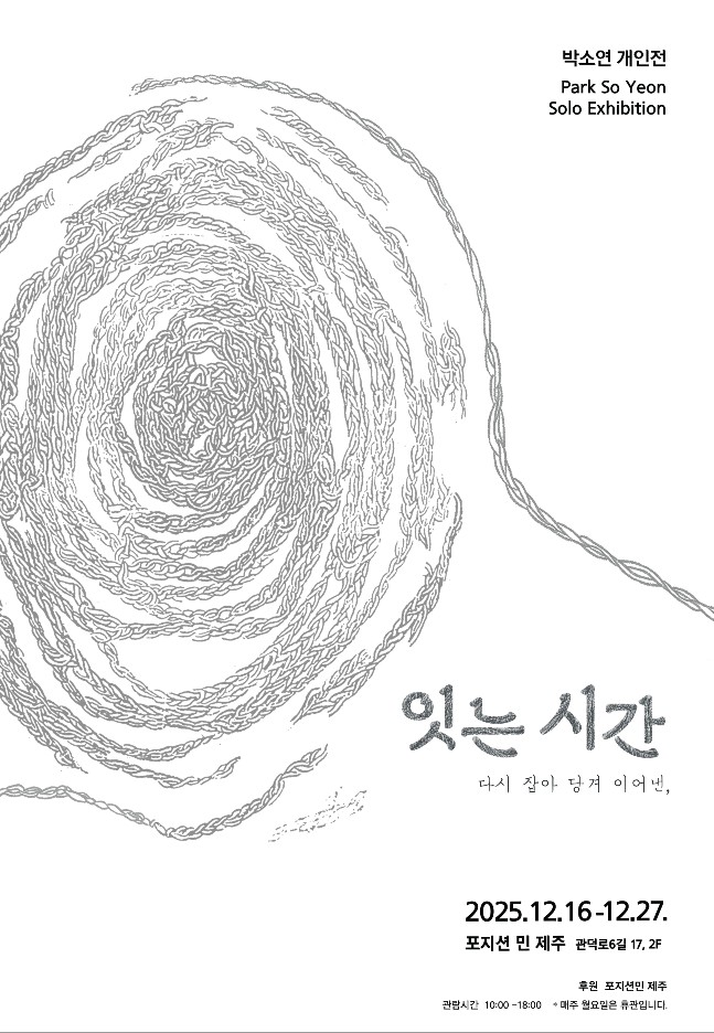 [탐미협 박소연 개인전]“잇는 시간-다시 잡아 당겨 이어낸,” [탐미협 박소연 개인전]“잇는 시간-다시 잡아 당겨 이어낸,” ○ 기간: 2025. 12. 16(화)~12. 27(토) (매주 월요일은 휴관)○ 관람시간: 10:00~18:00○ 오픈식: 2025. 12. 16(화) 17:00○ 장소: 포지션 민 제주 (관덕로6길 17, 2F) 많은 관심과 관람 부탁드립니다. 카테고리 없음 2025.12.15