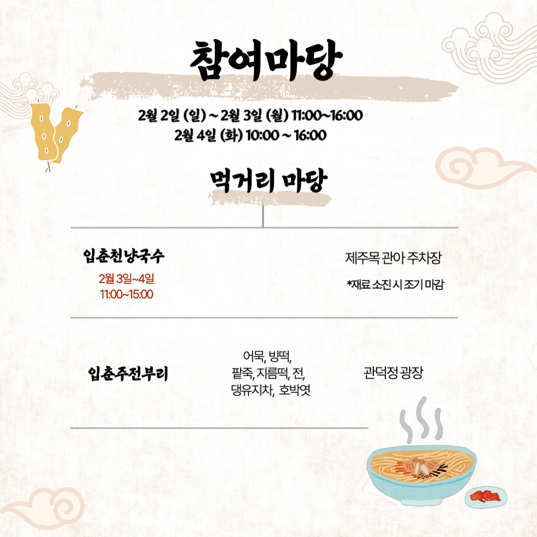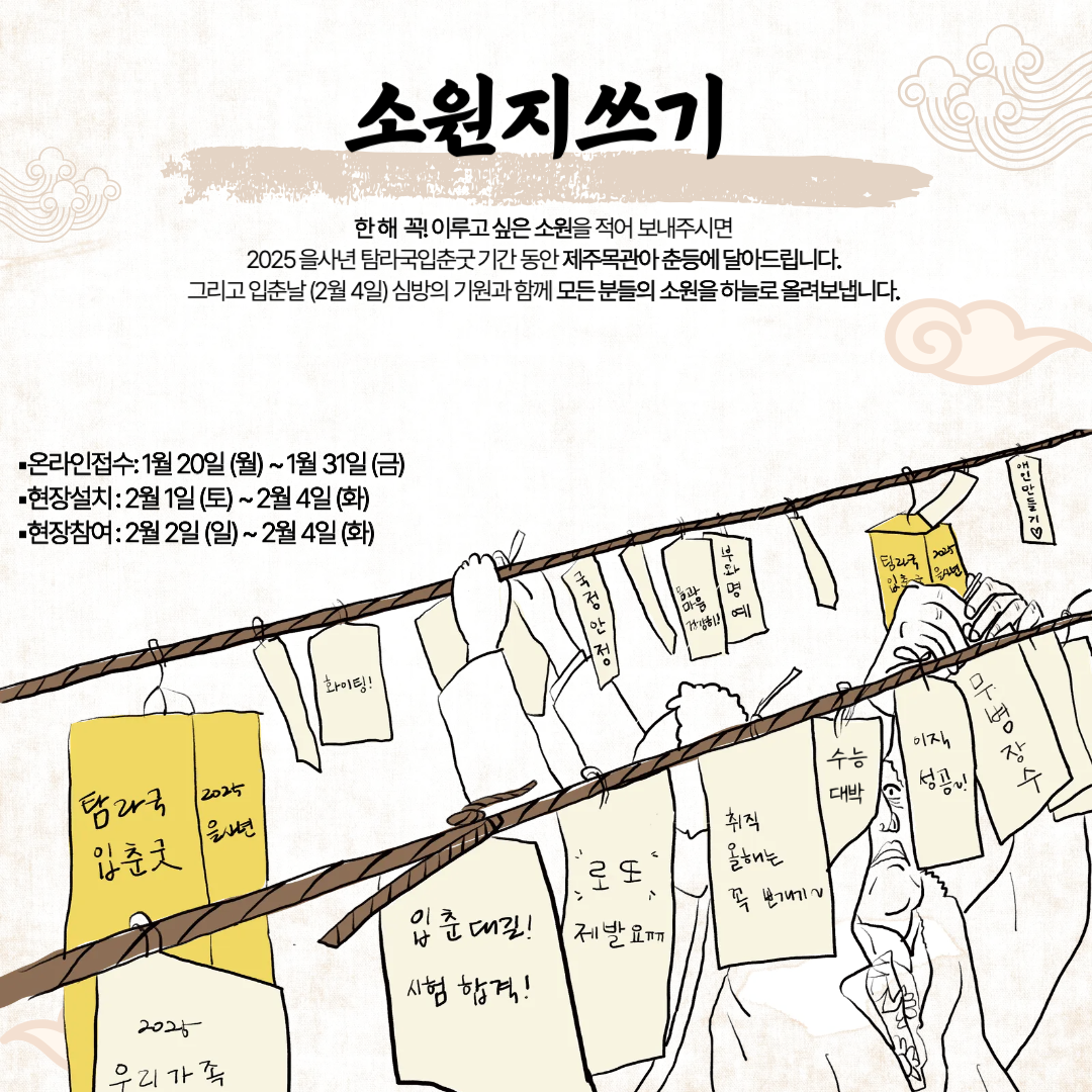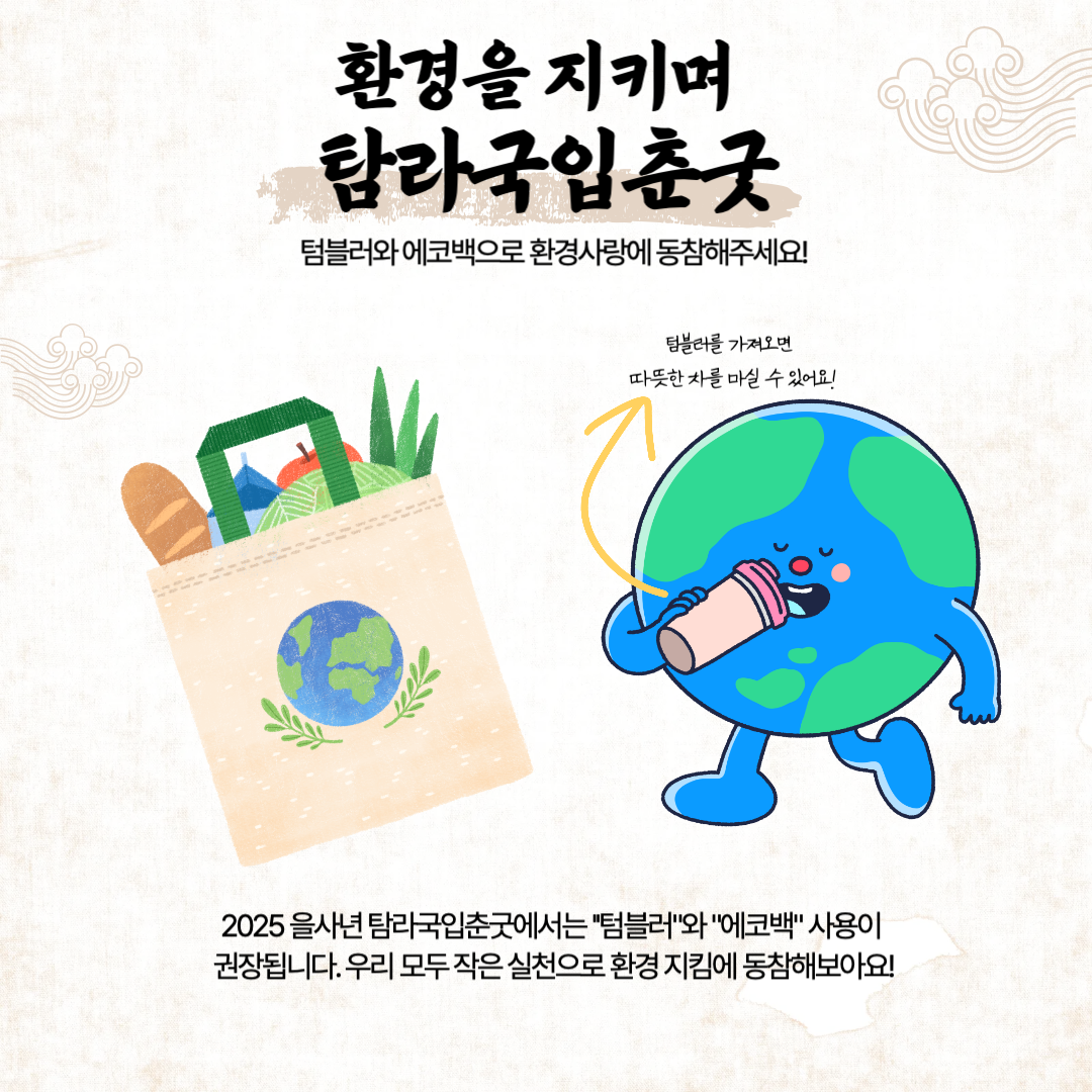 ☘️2025 을사년 탐라국입춘굿✨🌱봄, 터졌소이다!🎊 2025 탐라국입춘굿은 지구를 생각하는 행사로 준비하고 있습니다. 텀블러와 에코백을 가지고 환경을 생각하는 축제에 동참해주세요!텀블러를 가져오시면 안내 부스에서 따뜻한 차를 받을 수 있어요~ 우리 모두 작은 실천으로 환경 지킴에 함께해보아요~![입춘행사]💚제주시·서귀포시일원·관덕정·제주목관아🌱2월 2일 (일) 거리굿 / 09:00~16:30🌱2월 3일 (월) 열림굿 / 09:30~16:30🌱2월 4일 (화) 입춘굿 / 10:00~17:00 ☎️문의 064)758-0332
