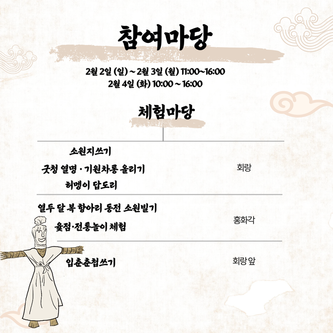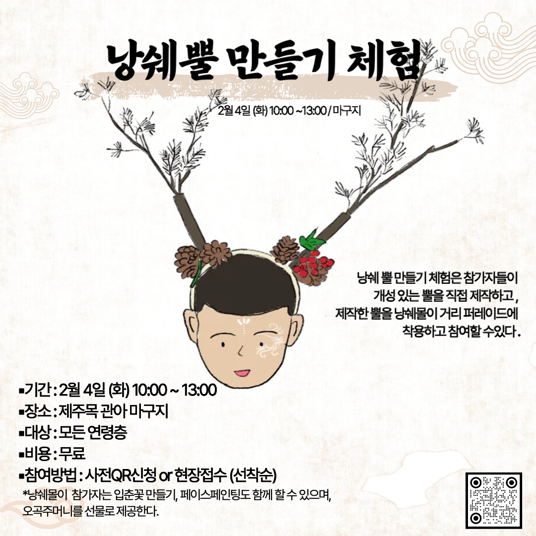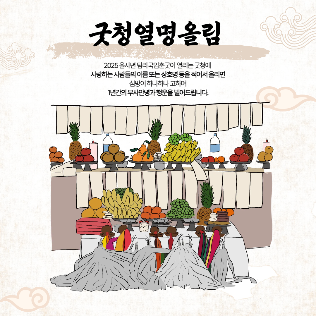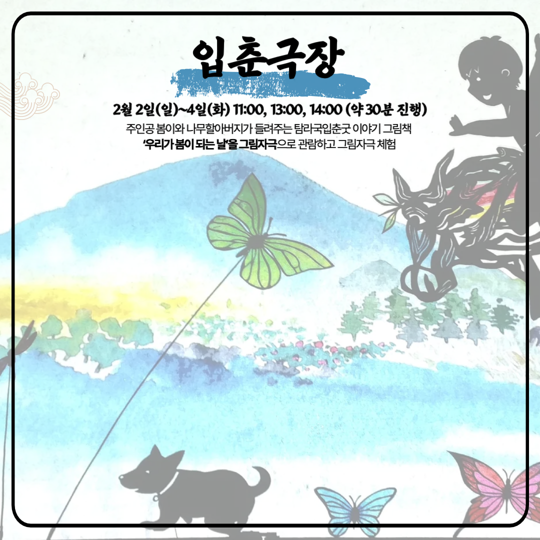 ☘️2025 을사년 탐라국입춘굿✨🌱봄, 터졌소이다!🎊 2025 탐라국입춘굿은 지구를 생각하는 행사로 준비하고 있습니다. 텀블러와 에코백을 가지고 환경을 생각하는 축제에 동참해주세요!텀블러를 가져오시면 안내 부스에서 따뜻한 차를 받을 수 있어요~ 우리 모두 작은 실천으로 환경 지킴에 함께해보아요~![입춘행사]💚제주시·서귀포시일원·관덕정·제주목관아🌱2월 2일 (일) 거리굿 / 09:00~16:30🌱2월 3일 (월) 열림굿 / 09:30~16:30🌱2월 4일 (화) 입춘굿 / 10:00~17:00 ☎️문의 064)758-0332